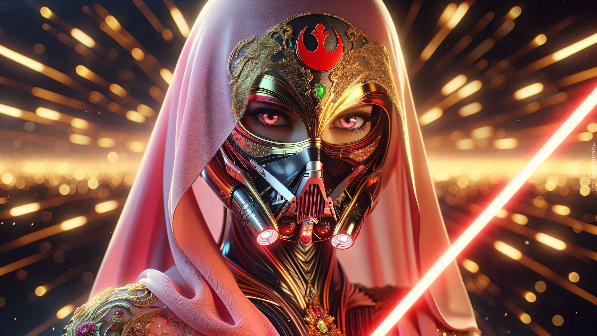 Edytor tapety: Kobieta w masce i welonie z mieczem świetlnym