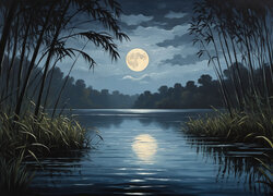 Edytor tapety: Trzciny nad jeziorem nocą w blasku księżyca