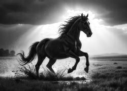 Edytor tapety: Koń galopujący przez mokradła w słonecznym blasku