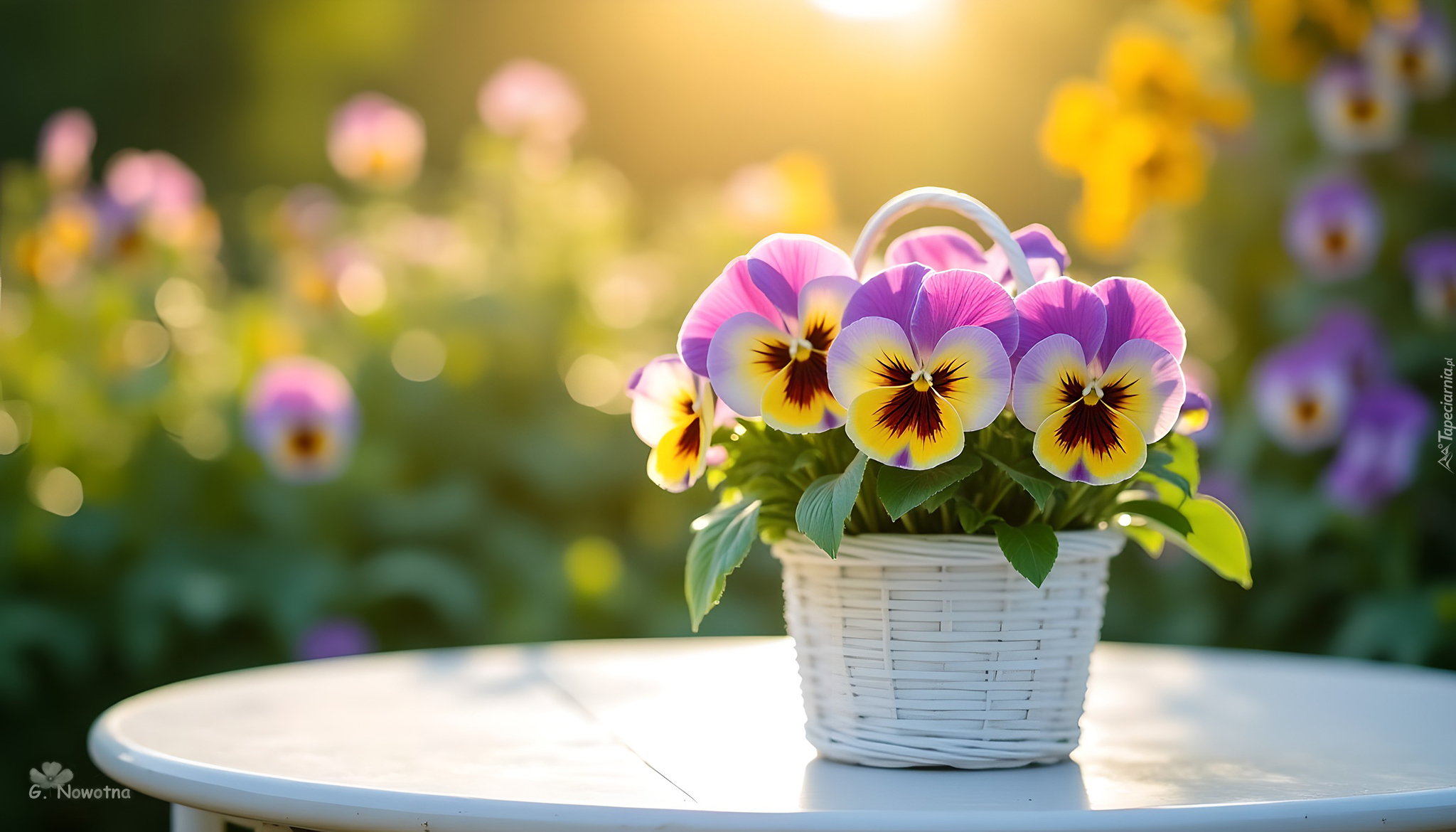 Edytor tapety: Kolorowe bratki w białym koszyczku na okrągłym stole