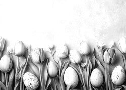 Edytor tapety: Kolorowe pisanki ułożone między kolorowymi tulipanami na niebieskim tle