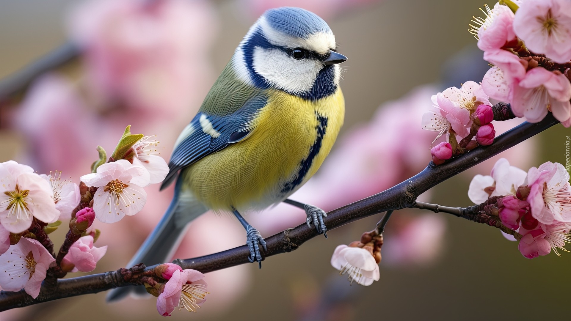 Edytor tapety: Sikorka modraszka na ukwieconej gałązce