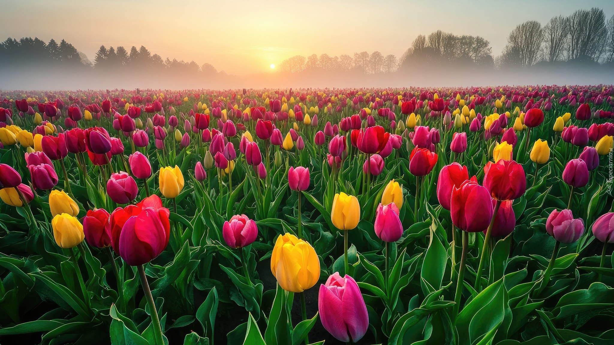 Edytor tapety: Plantacja kolorowych tulipanów w porannej mgle