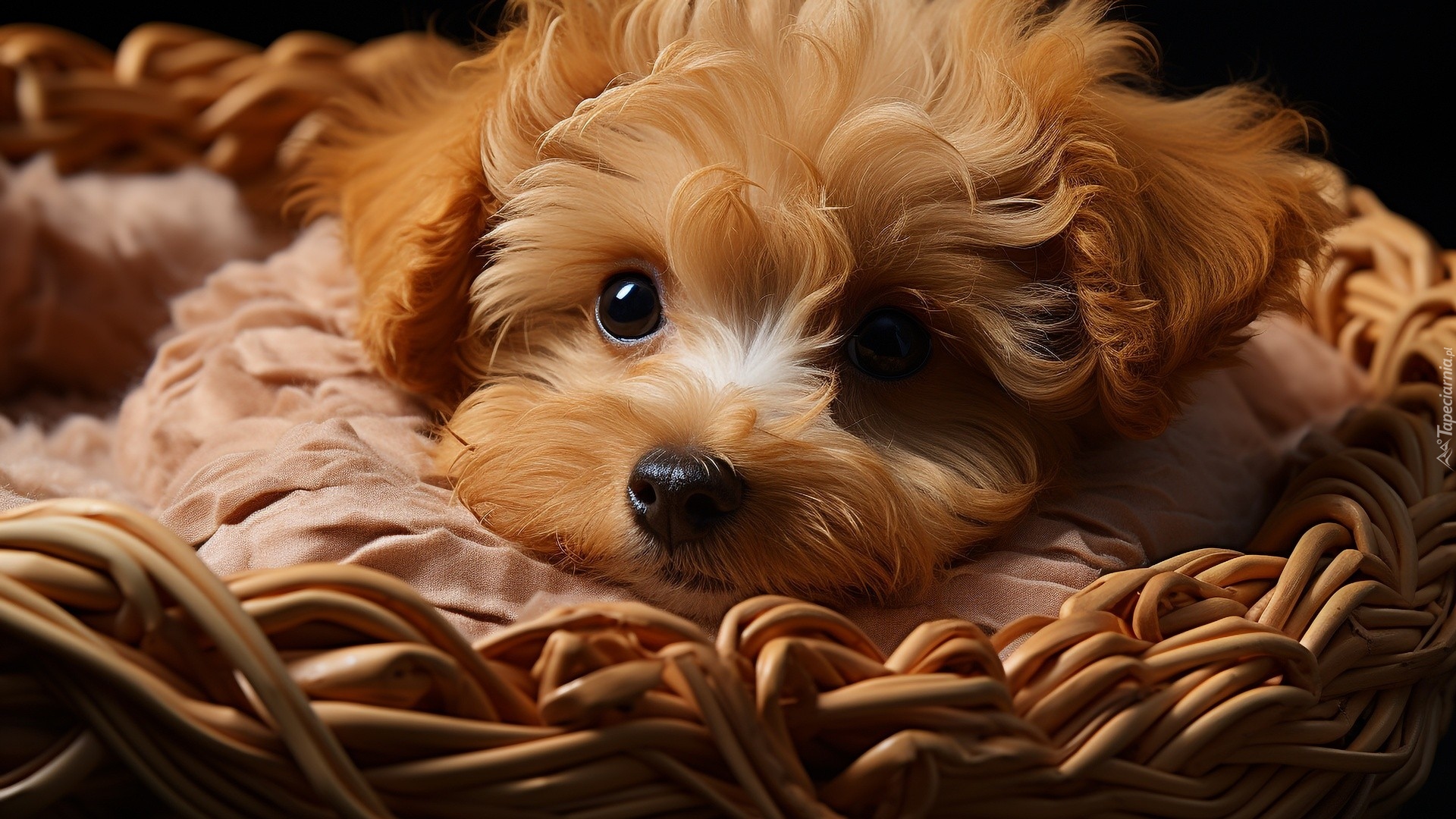 Edytor tapety: Mordka brązowego szczeniaka leżącego na posłaniu w koszu