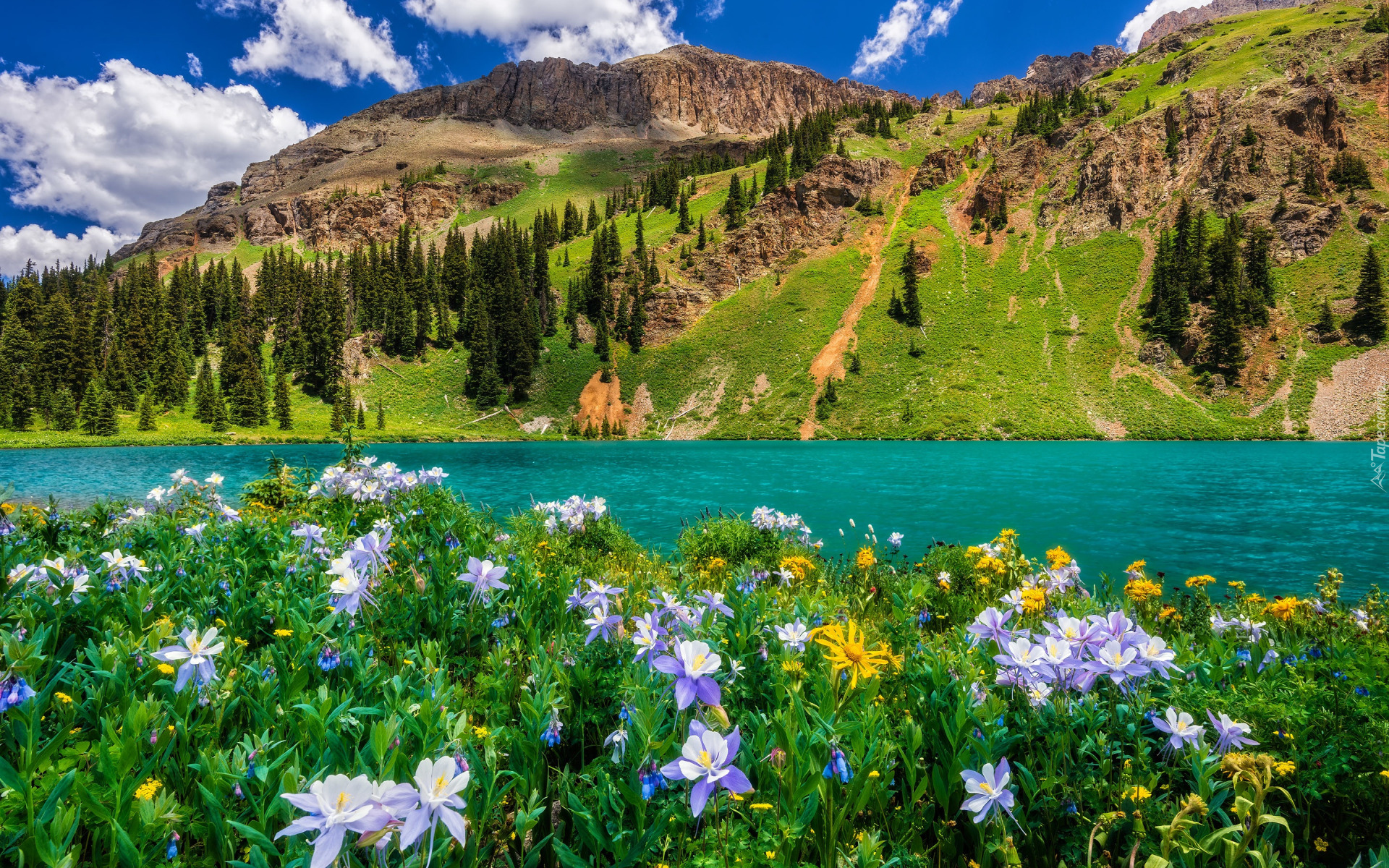 Edytor tapety: Kwiaty na łące i góry nad jeziorem