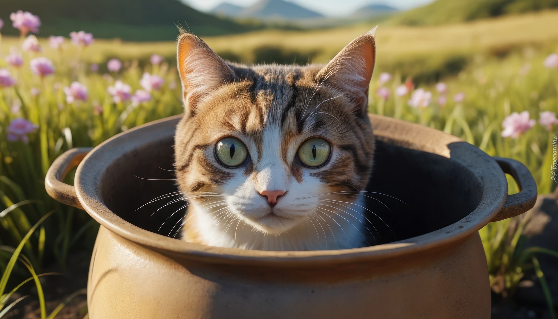 Edytor tapety: Kot w dużym garnku na łące
