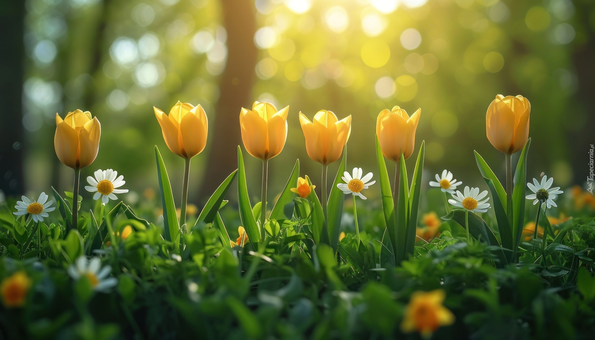 Edytor tapety: Żółte tulipany i białe kwiaty w słonecznym blasku