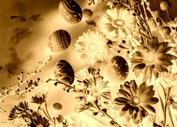 Edytor tapety: Kolorowe pisanki i gerbery na niebieskim tle