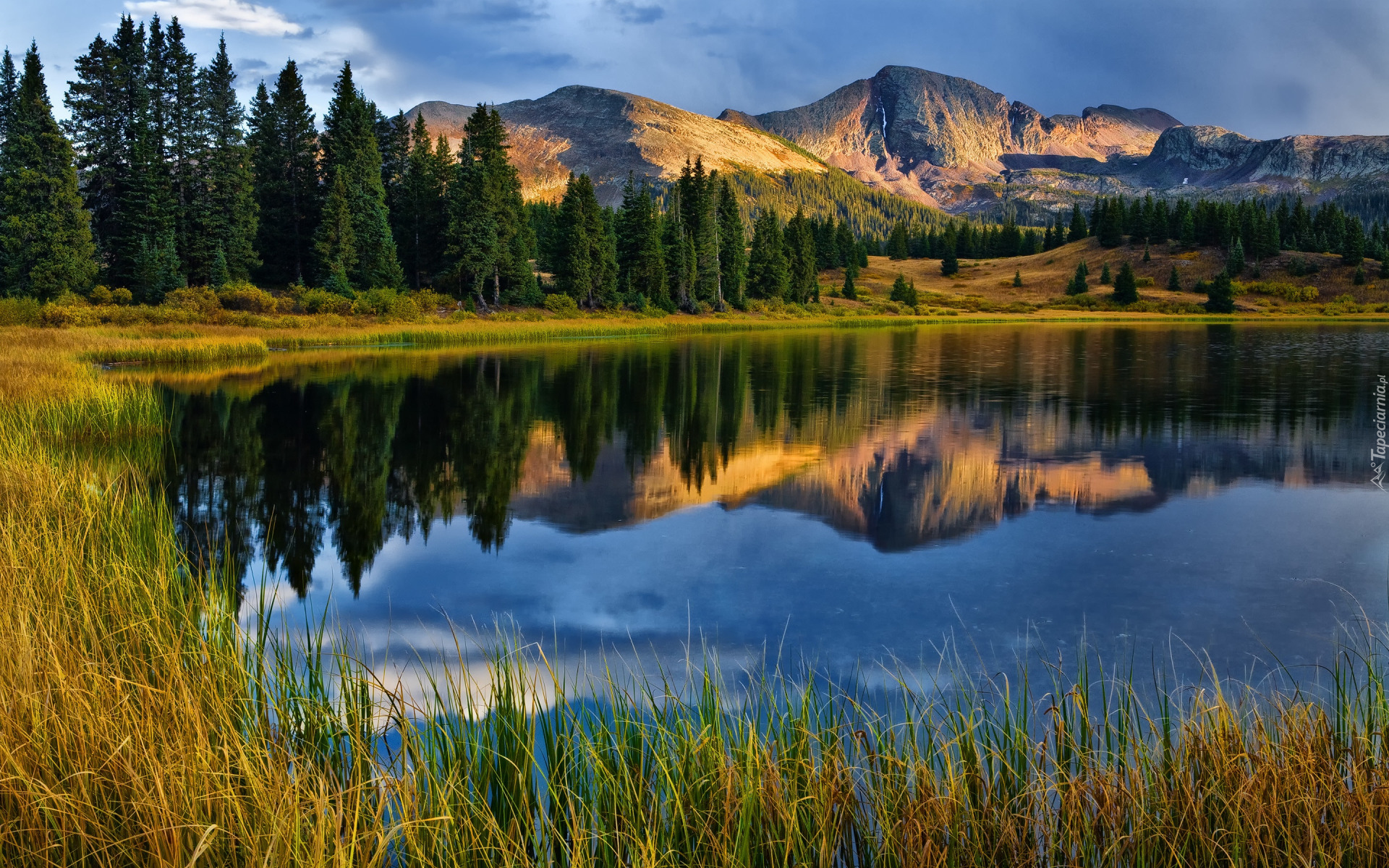 Edytor tapety: Odbicie w jeziorze drzew i rozświetlonych gór