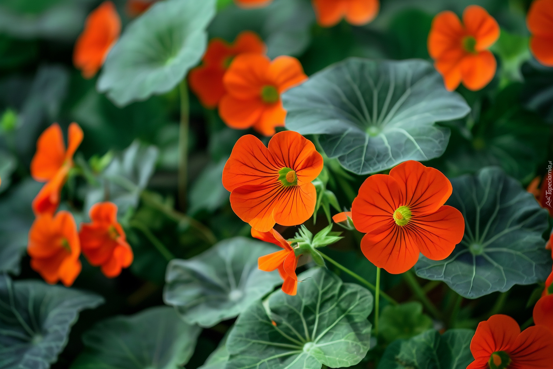 Edytor tapety: Pomarańczowe kwiaty nasturcji i liście
