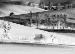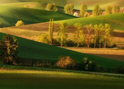 Edytor tapety: Rozświetlone drzewa i pola na zielonych wzgórzach