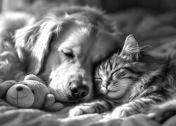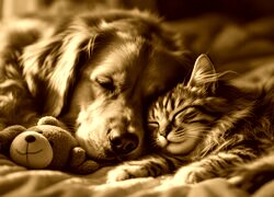 Edytor tapety: Śpiący pies z kotkiem obok pluszowego misia