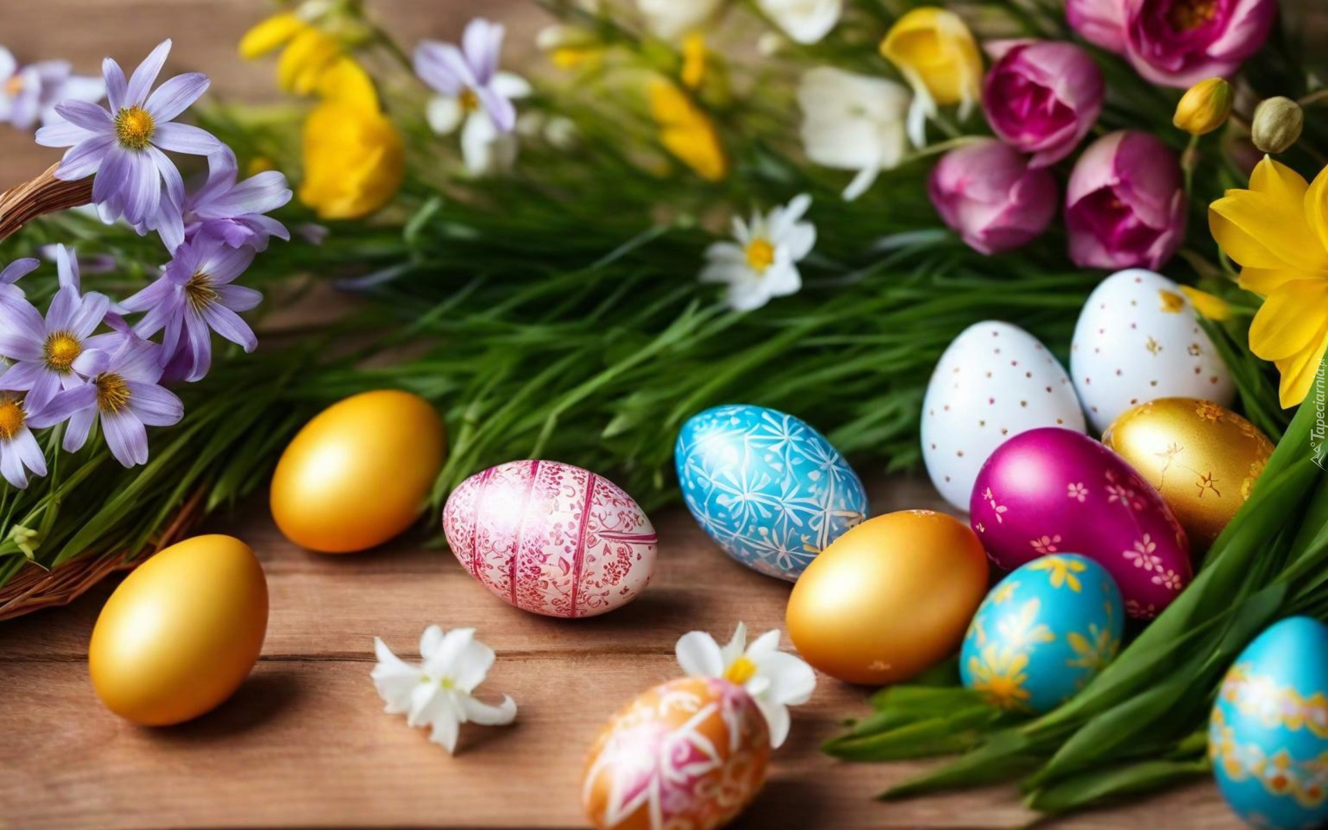 Edytor tapety: Kolorowe pisanki i wiosenne kwiaty na deskach