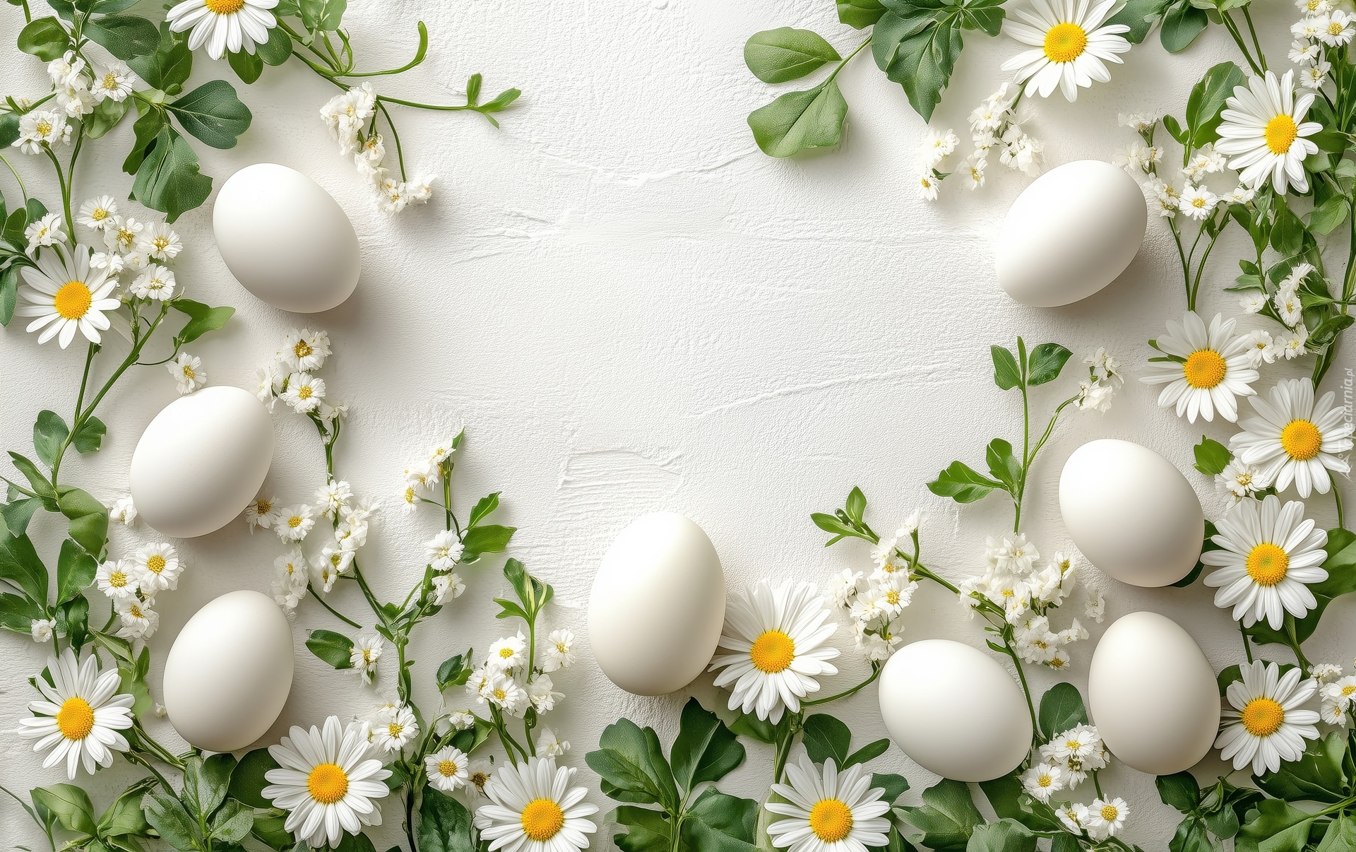 Edytor tapety: Białe jajka i kwiaty ułożone na białym tle