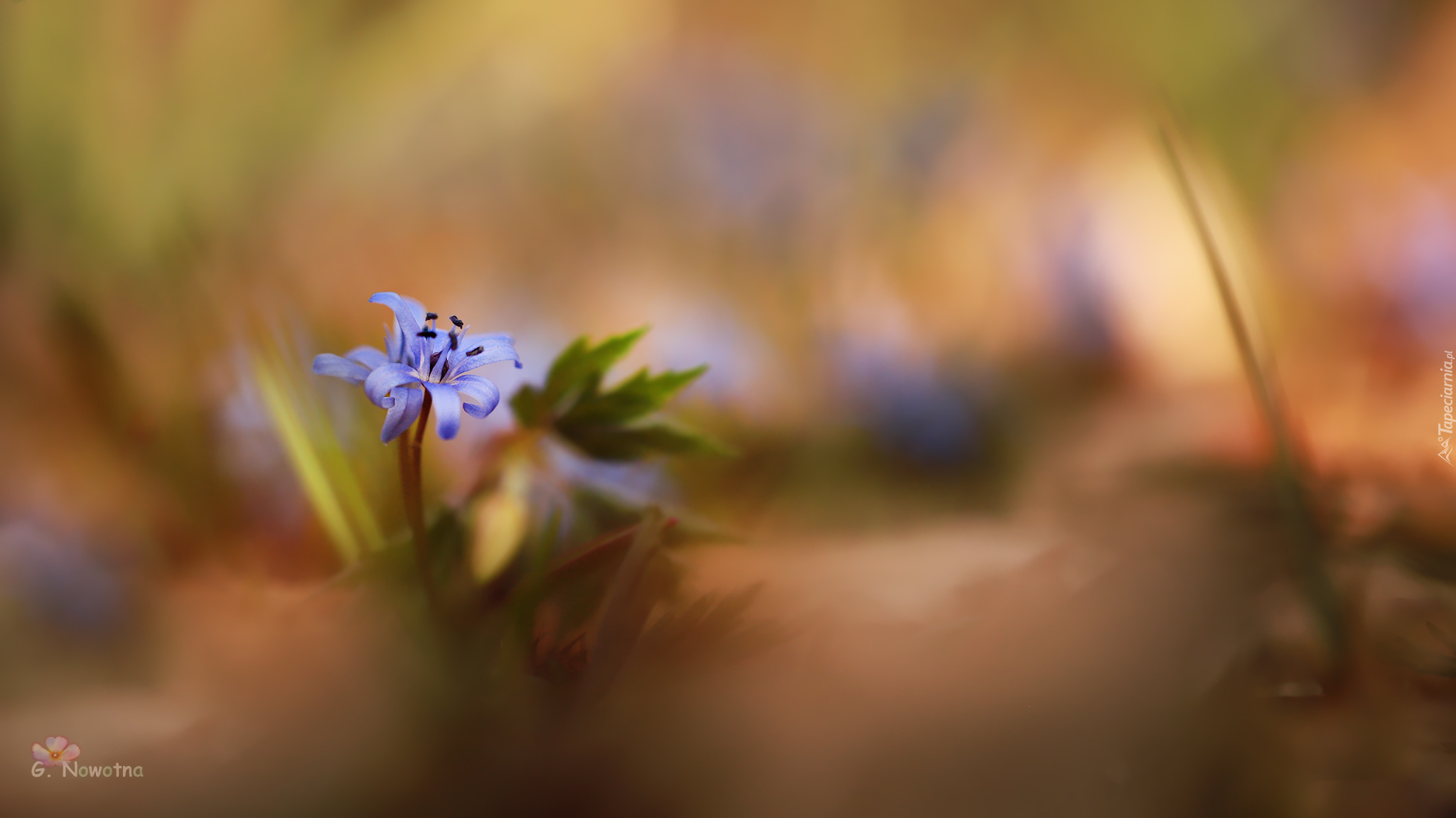 Edytor tapety: Rozkwitnięty mały niebieski kwiat na rozmytym tle