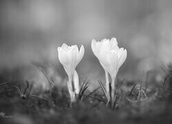 Edytor tapety: Białe krokusy w trawie na rozmytym tle