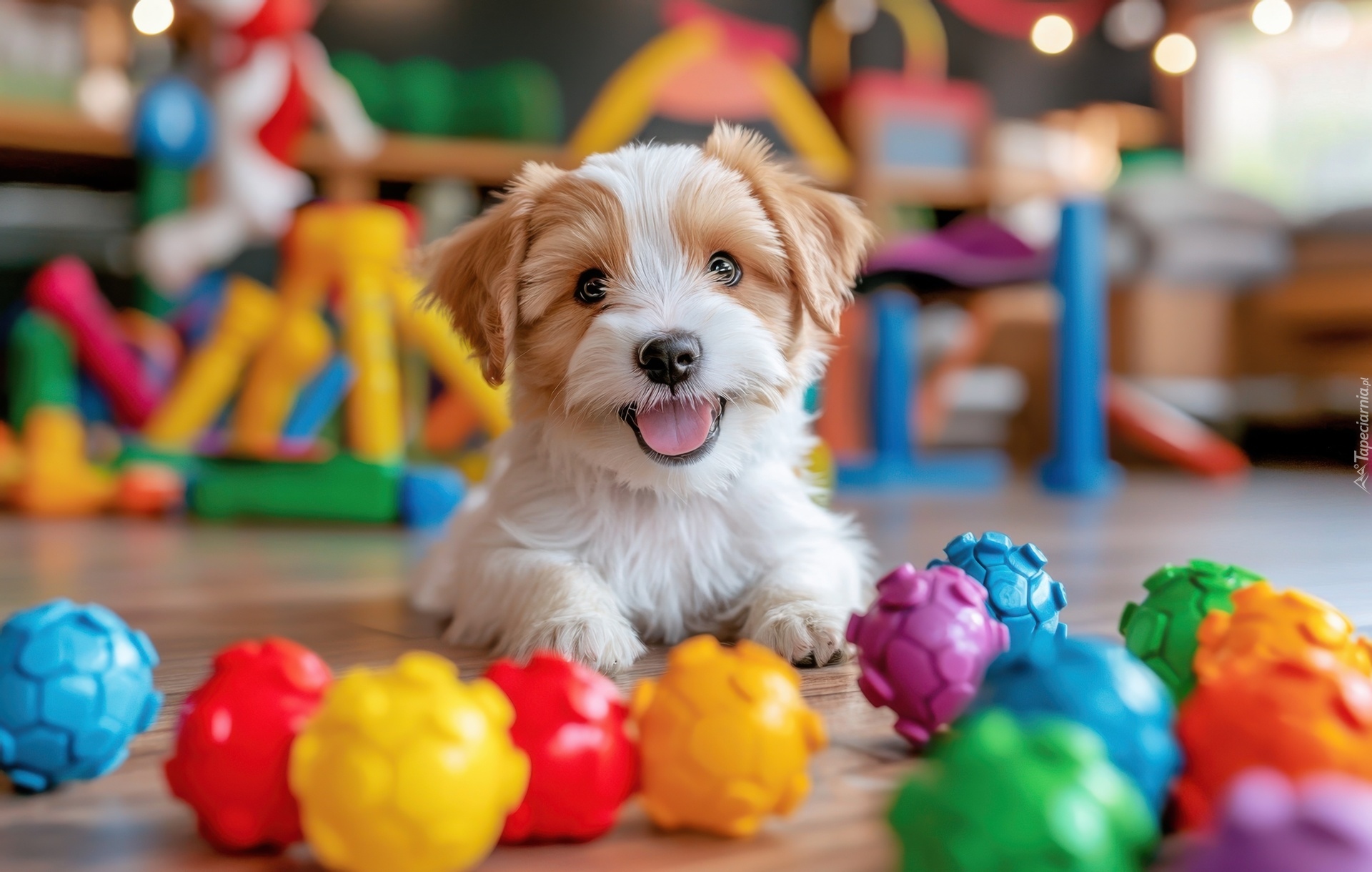 Edytor tapety: Biało-brązowy szczeniak leżący obok kolorowych piłeczek
