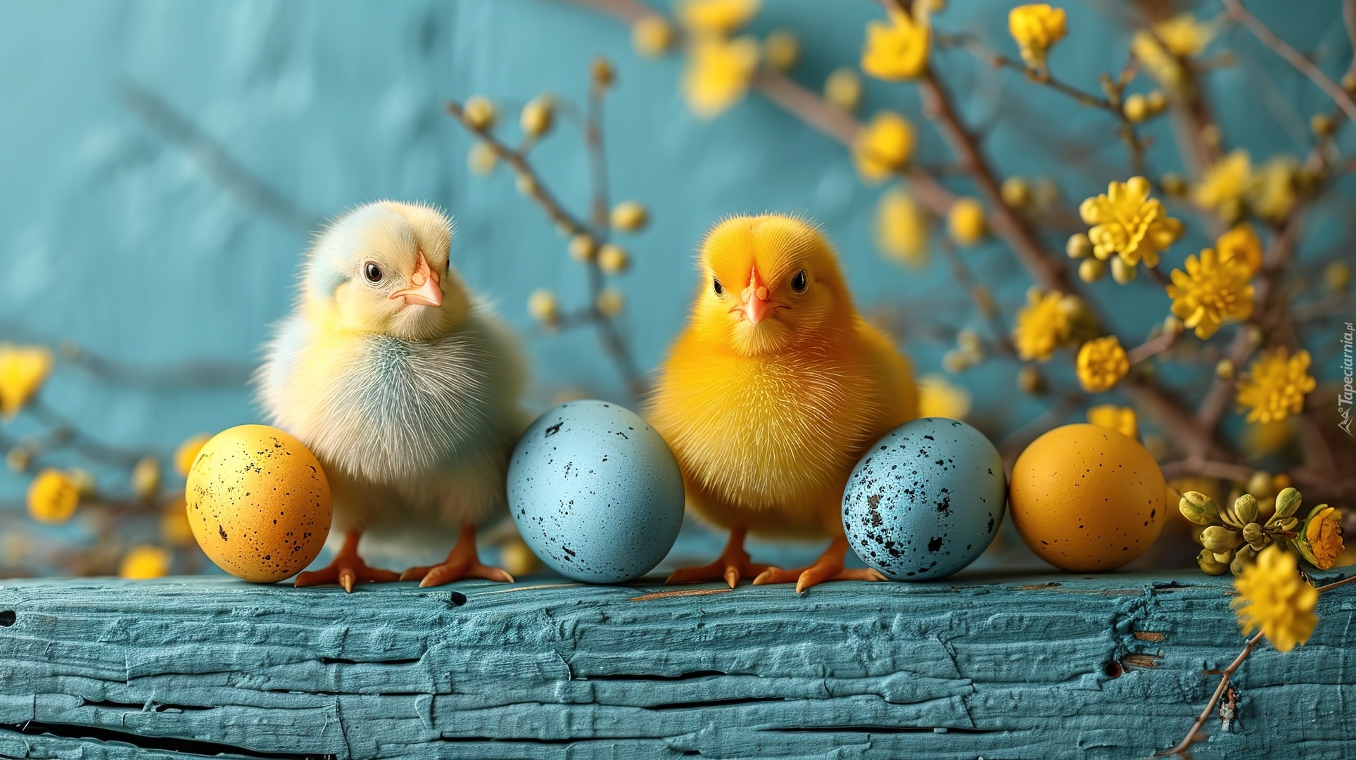Edytor tapety: Dwa kurczaczki obok kolorowych pisanek i żółtych kwiatów