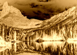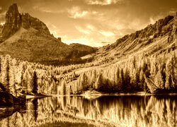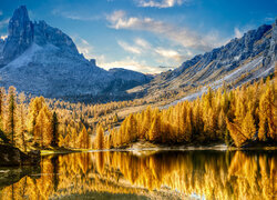 Edytor tapety: Pożółkłe drzewa nad jeziorem Lago Federa i góry Dolomity w tle