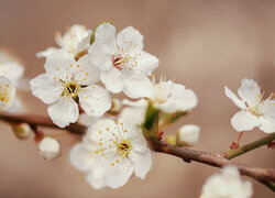 Edytor tapety: Rozkwitnięte białe kwiaty na gałązce drzewa owocowego