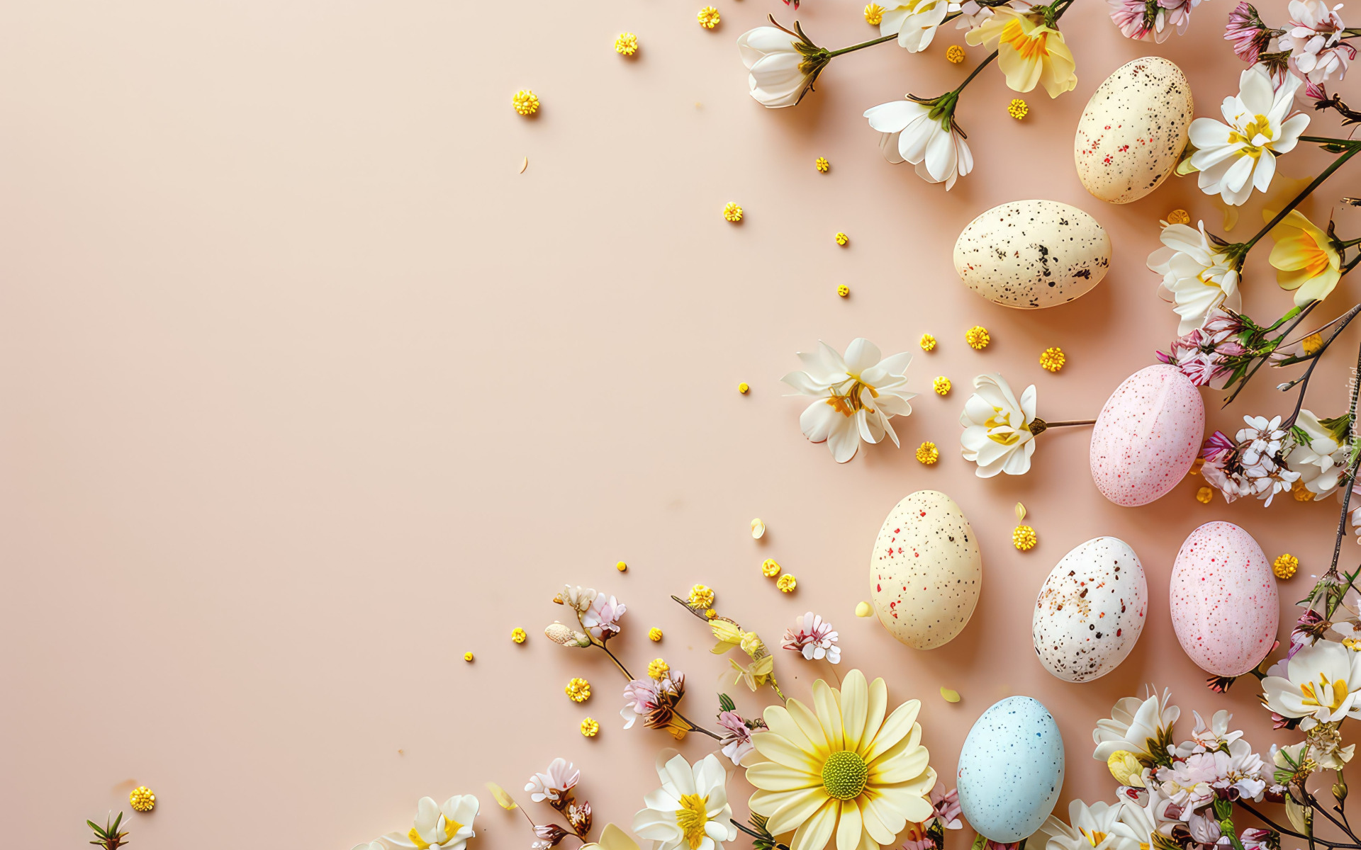 Edytor tapety: Nakrapiane kolorowe pisanki i kwiaty na kremowym tle