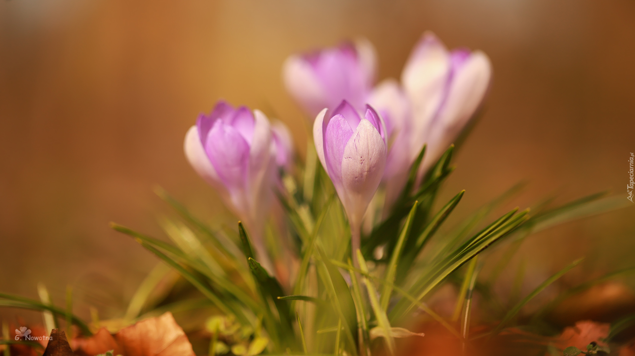 Edytor tapety: Rozświetlona światłem kępka rozkwitających fioletowych krokusów
