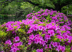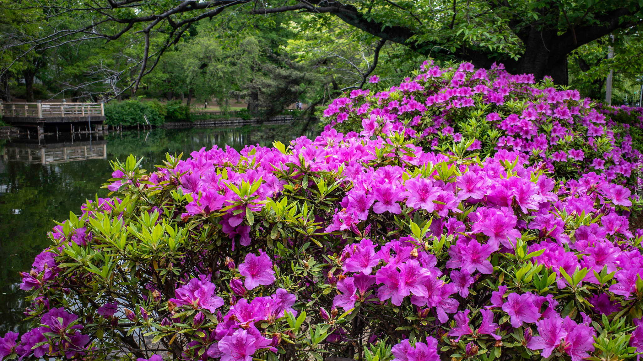 Edytor tapety: Kwitnący na różowo krzew różanecznika