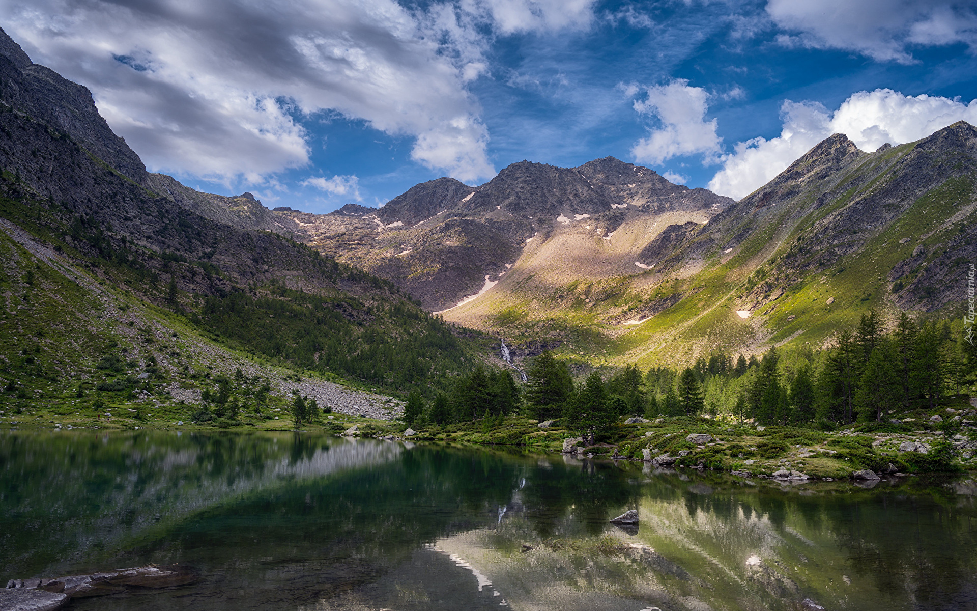 Edytor tapety: Drzewa nad górskim jeziorem i chmury na niebie