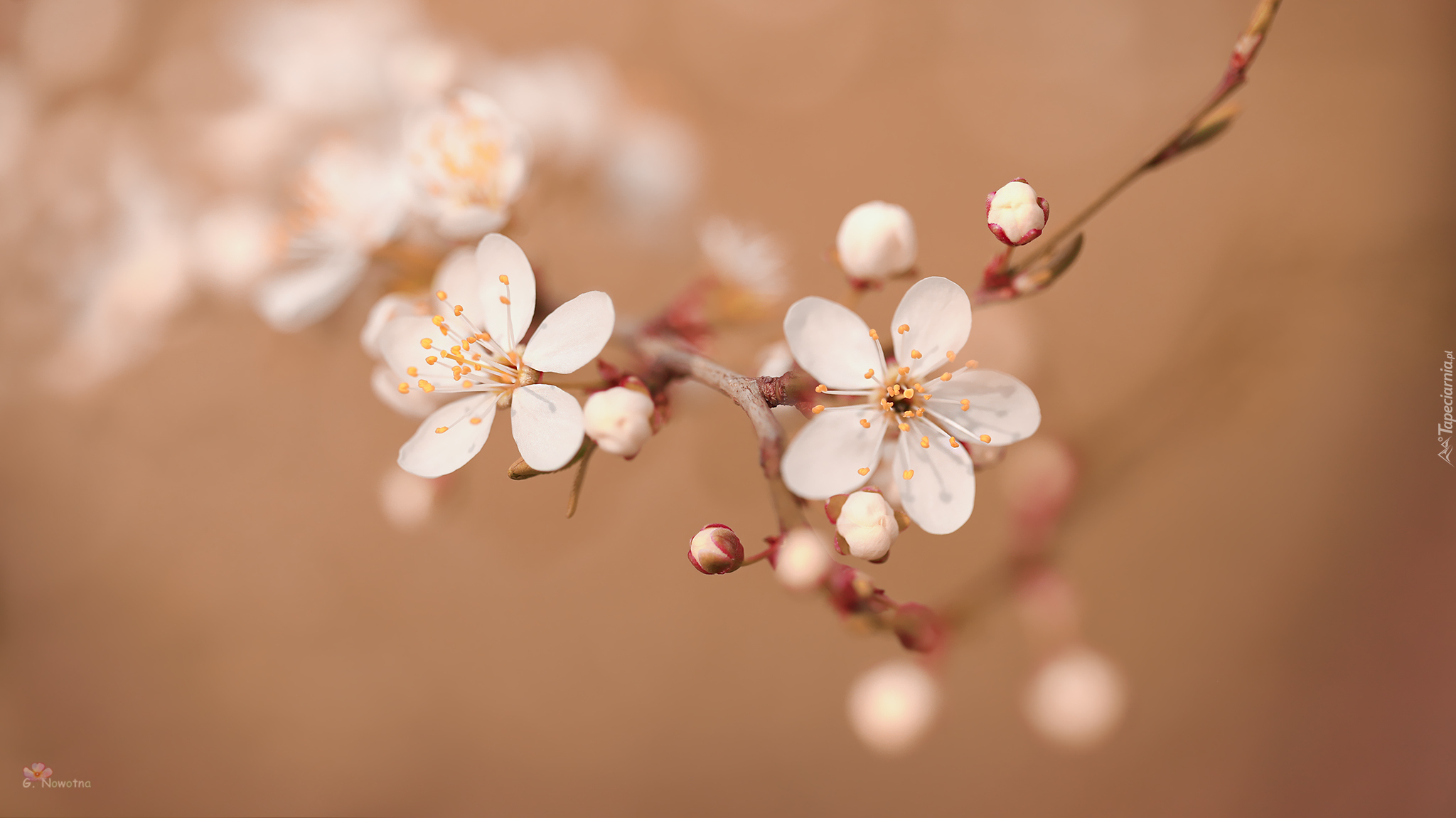 Edytor tapety: Gałązka drzewa owocowego z białymi kwiatami i pąkami