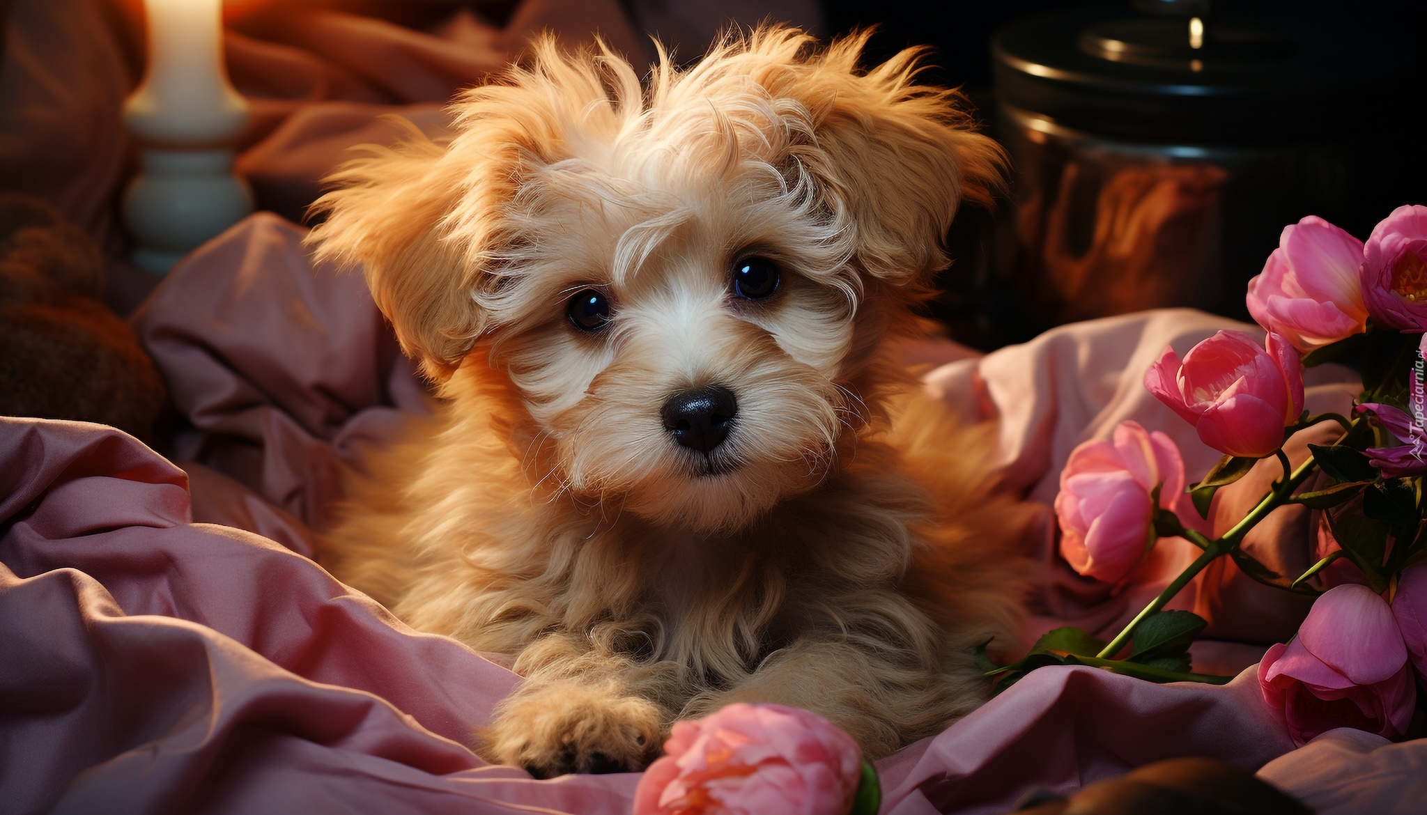 Edytor tapety: Brązowy szczeniak leżący obok kwiatów