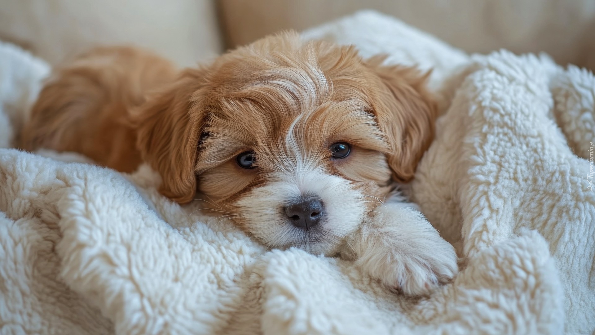 Edytor tapety: Rudo-biały szczeniak na białym kocu