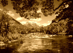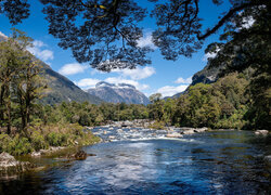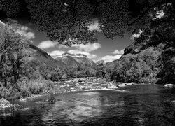 Edytor tapety: Drzewa przy kamienistej rzece i góry
