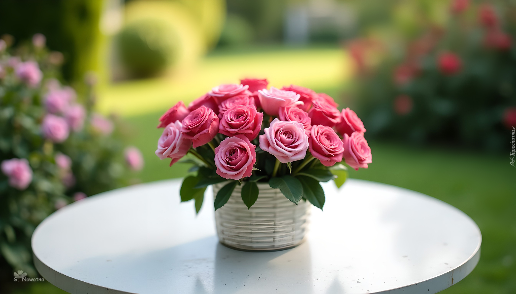 Edytor tapety: Bukiet różowych róż w koszyku na stoliku
