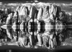 Edytor tapety: Odbicie skał w jeziorze Watson Lake