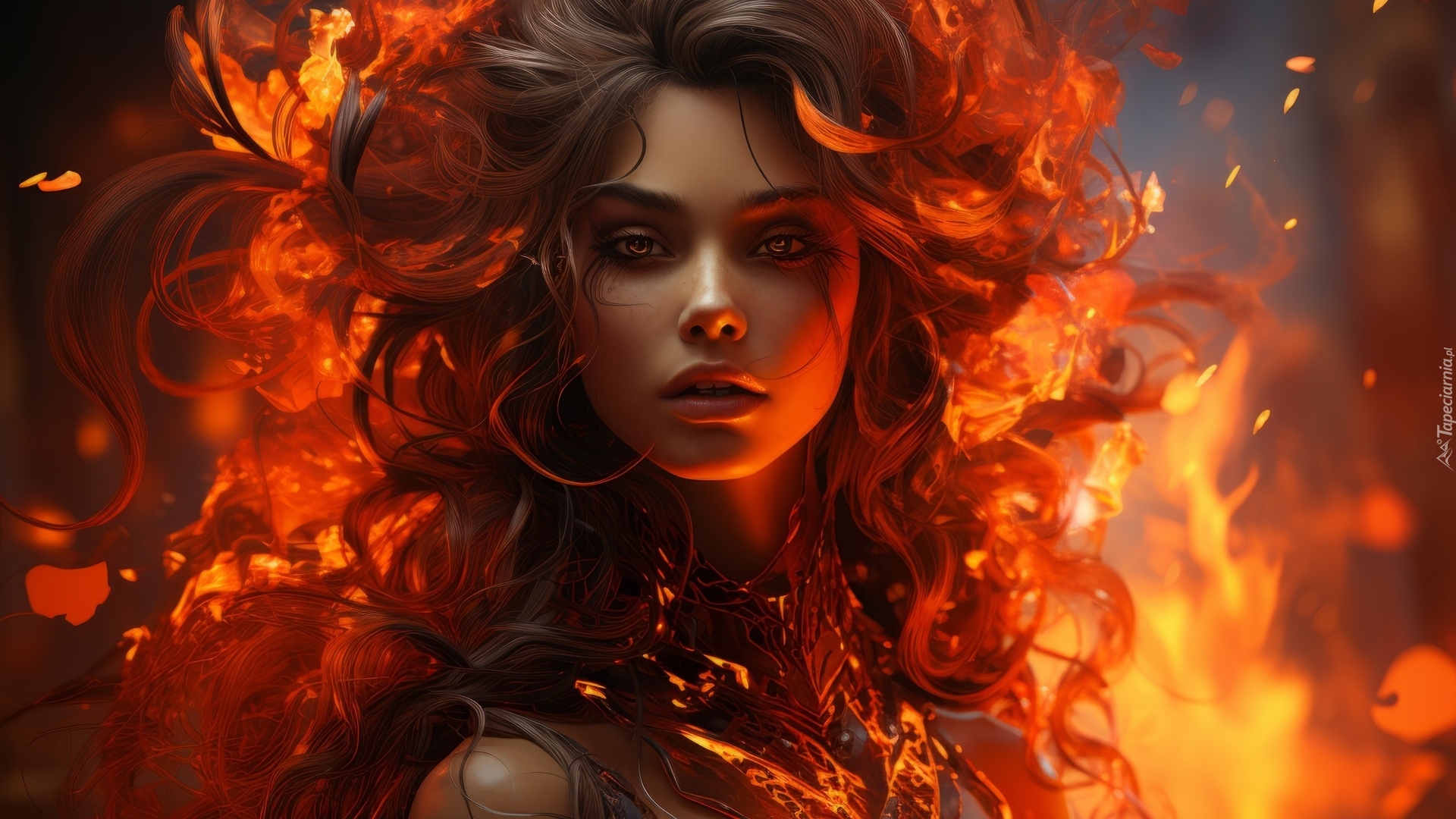 Edytor tapety: Długowłosa kobieta na tle płomieni