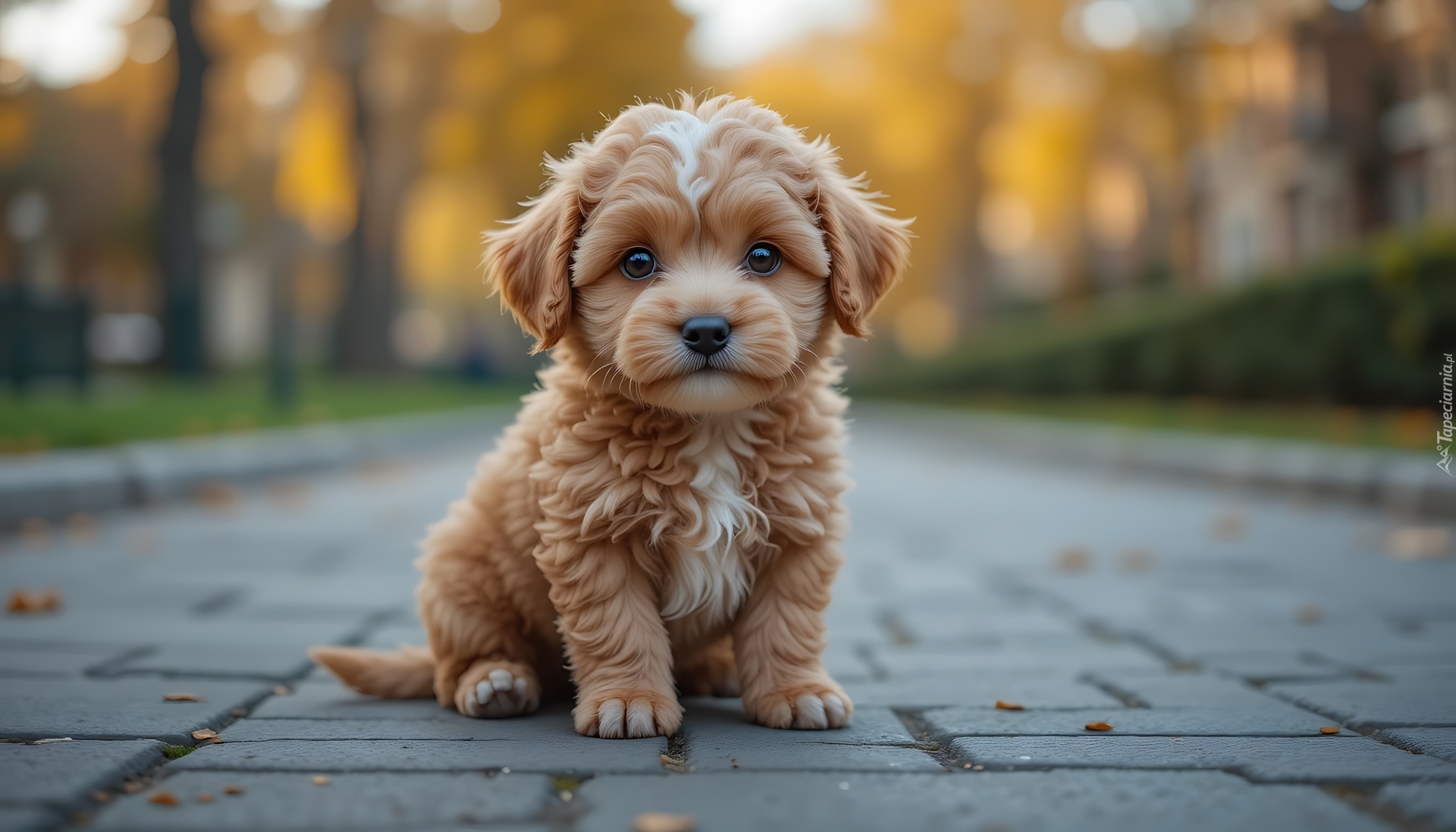 Edytor tapety: Mały brązowy szczeniak siedzący na brukowanej drodze