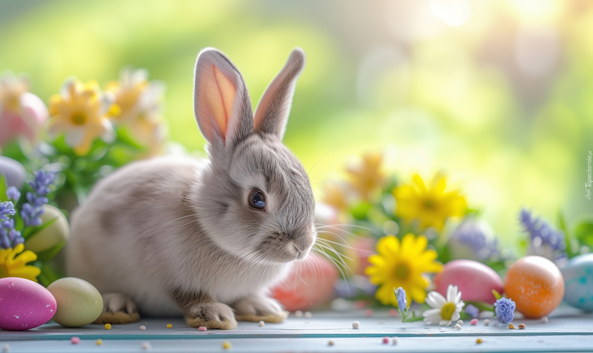 Edytor tapety: Królik i pisanki oraz kwiaty na deskach