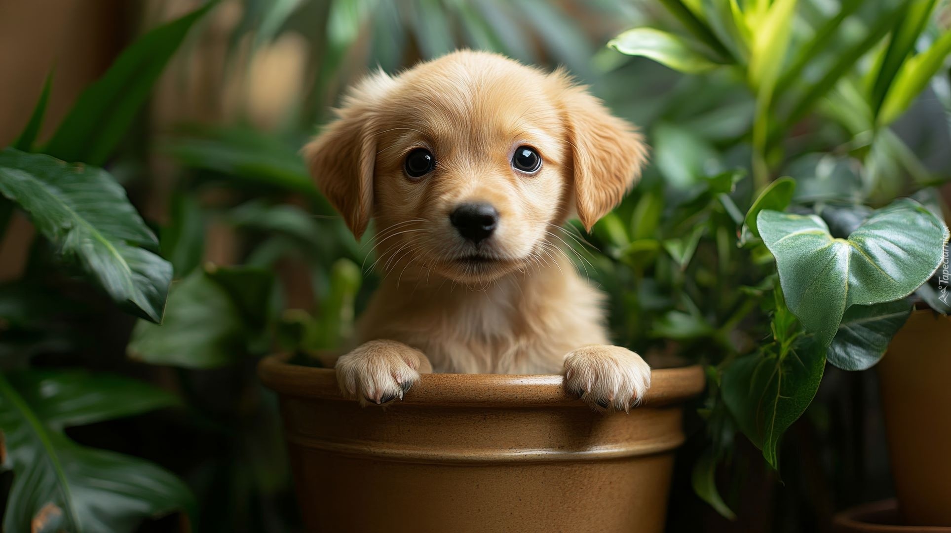 Edytor tapety: Jasnobrązowy szczeniak w donicy wśród zielonych liści
