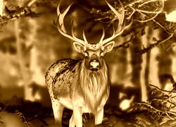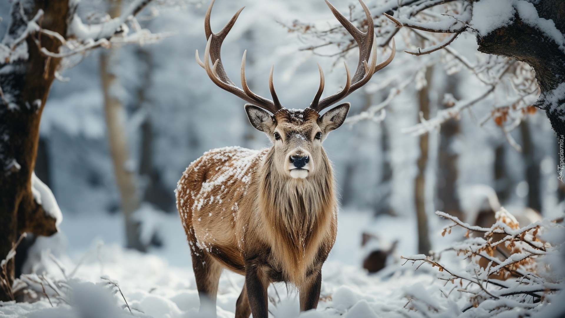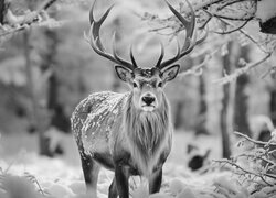 Edytor tapety: Jeleń w śniegu pod drzewami w lesie