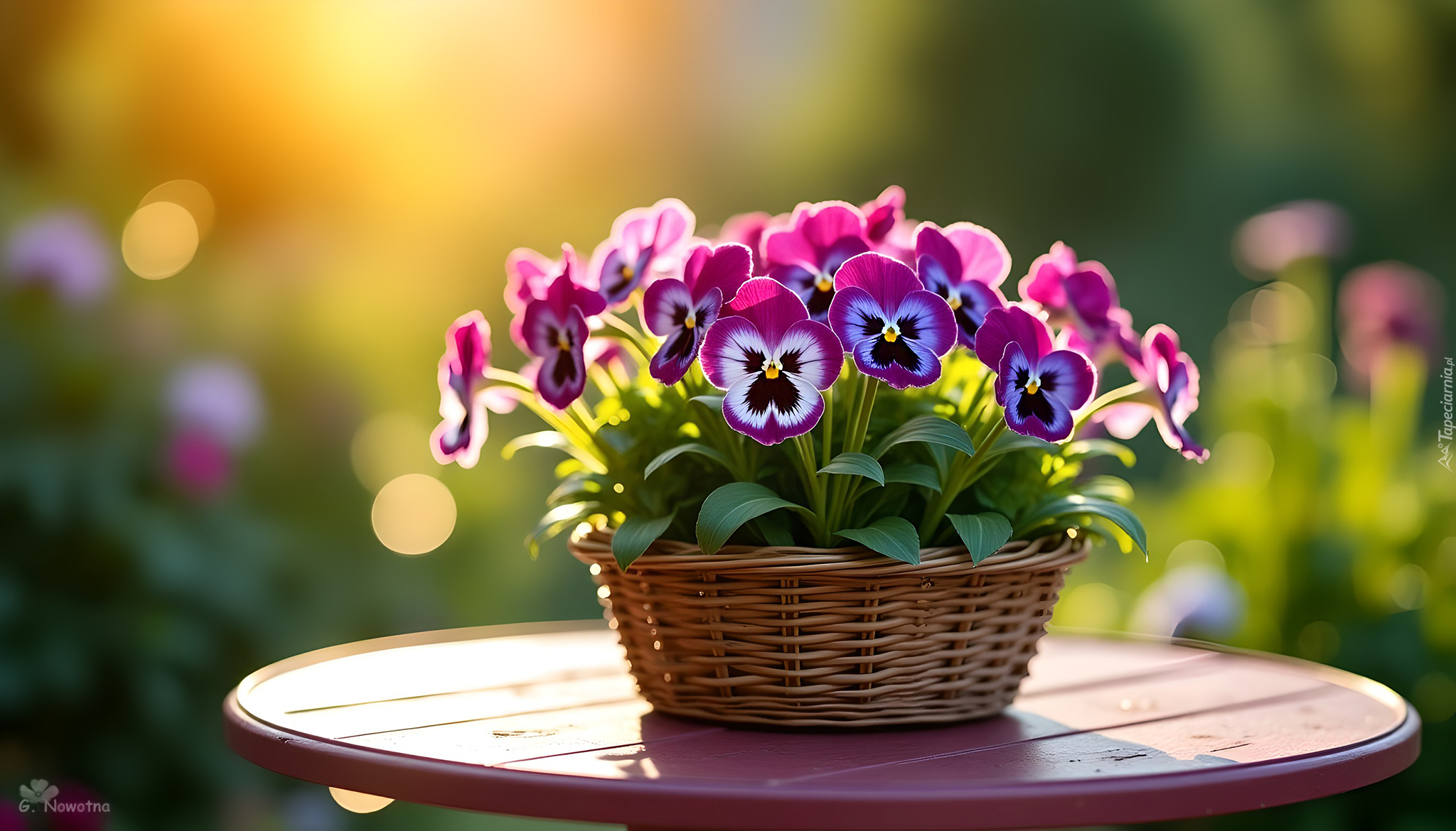Edytor tapety: Fioletowo-białe bratki w wiklinowym koszyku na stoliku