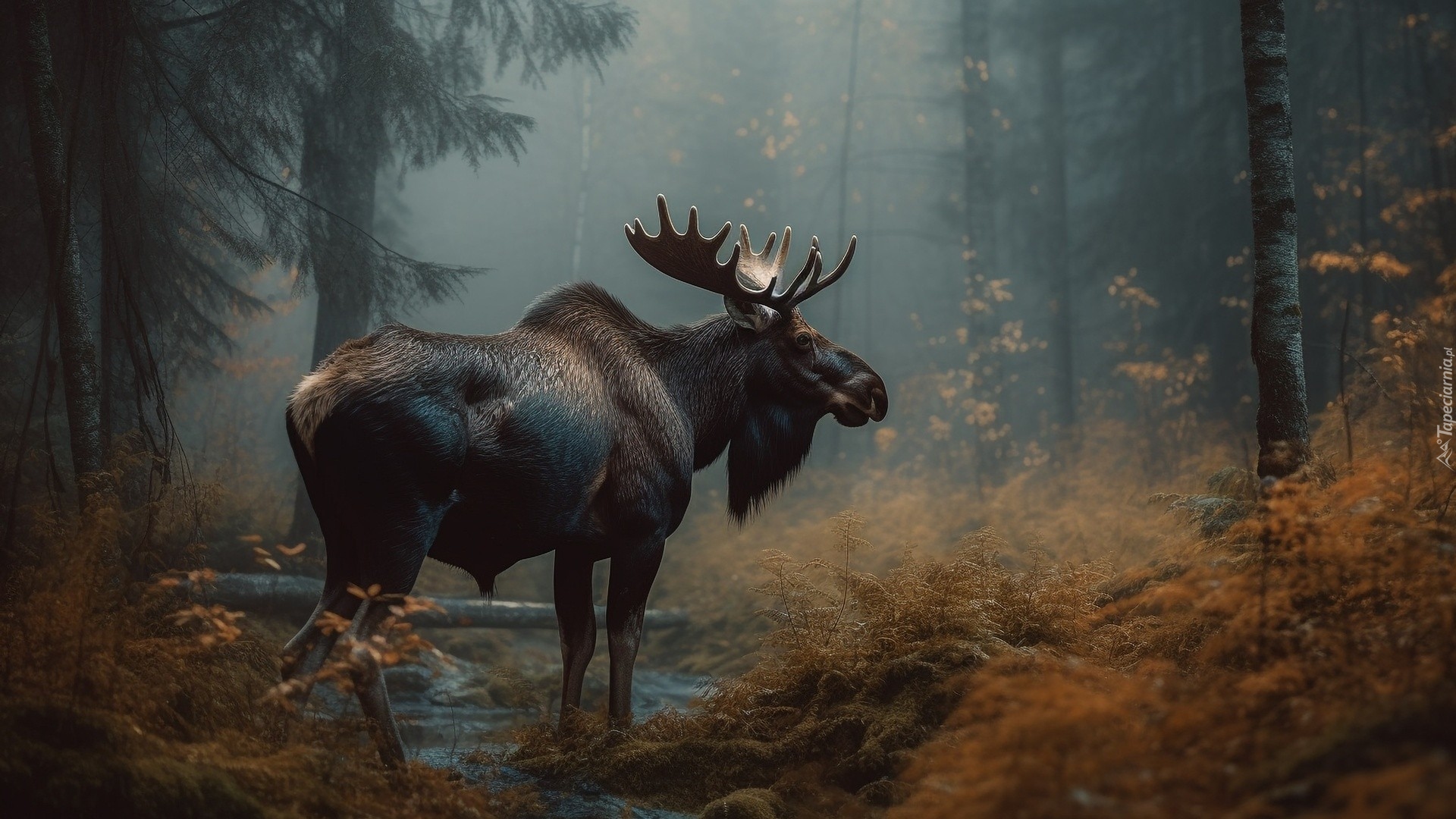 Edytor tapety: Łoś obok suchych roślin w zamglonym lesie