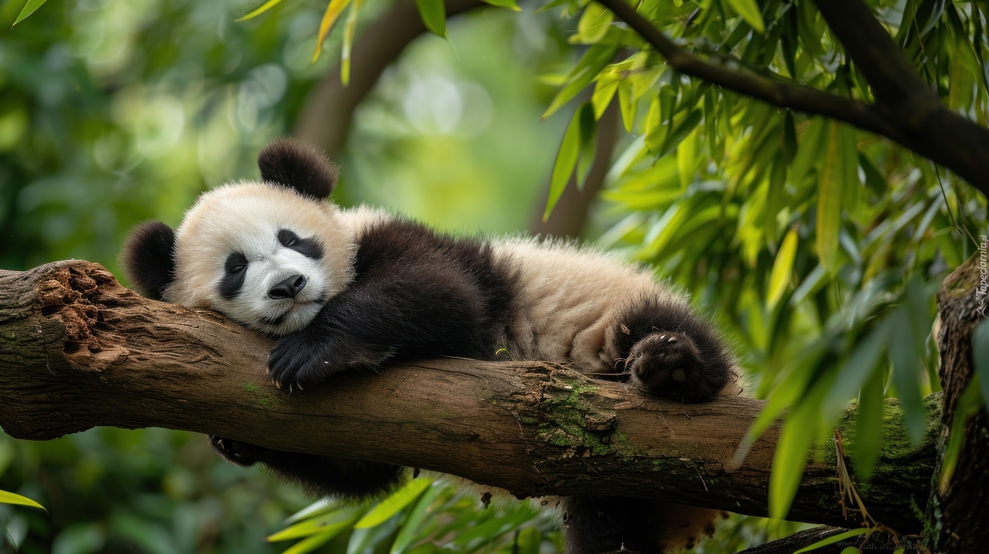 Edytor tapety: Młoda panda śpiąca na konarze drzewa