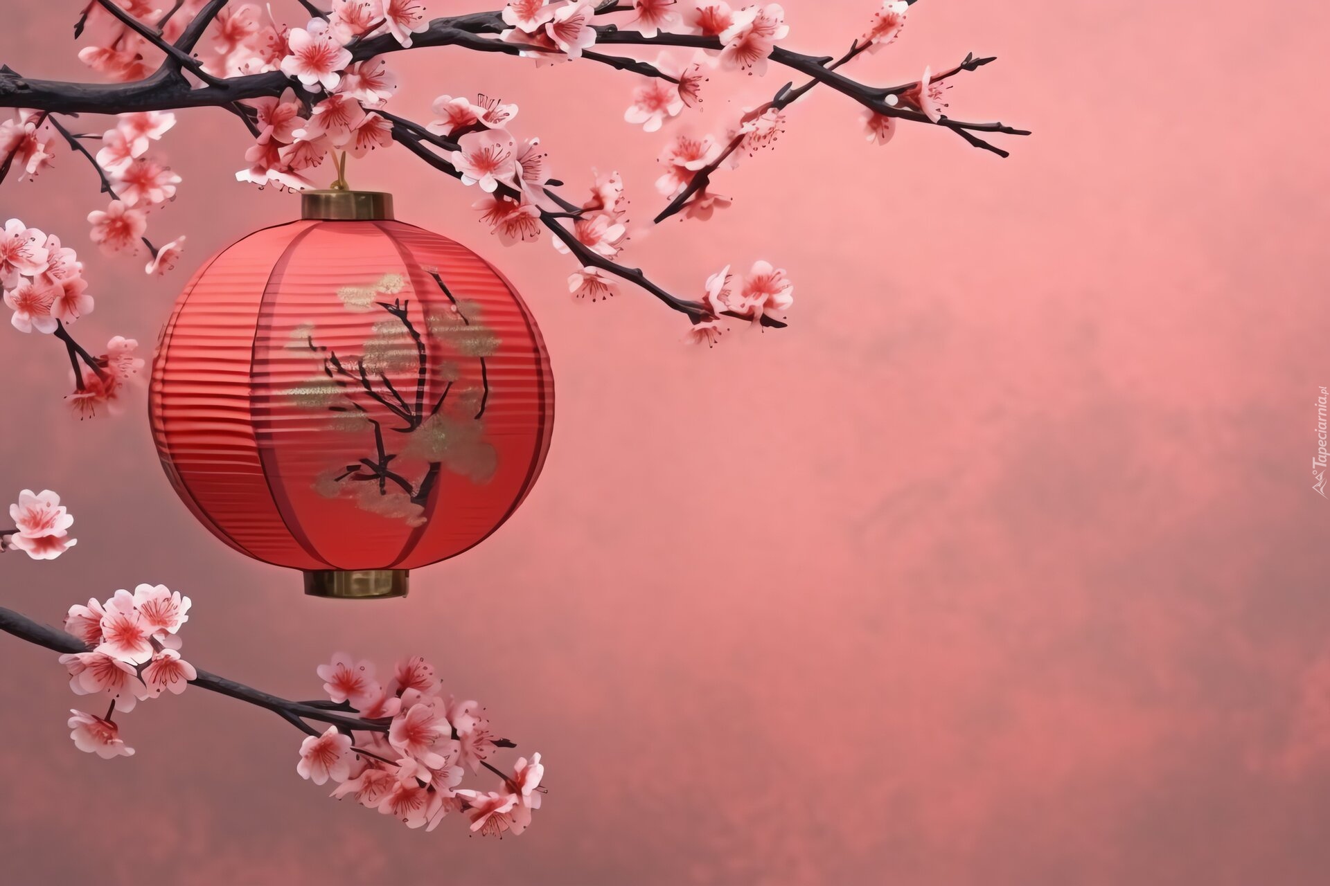 Edytor tapety: Czerwony lampion zawieszony na ukwieconych gałązkach