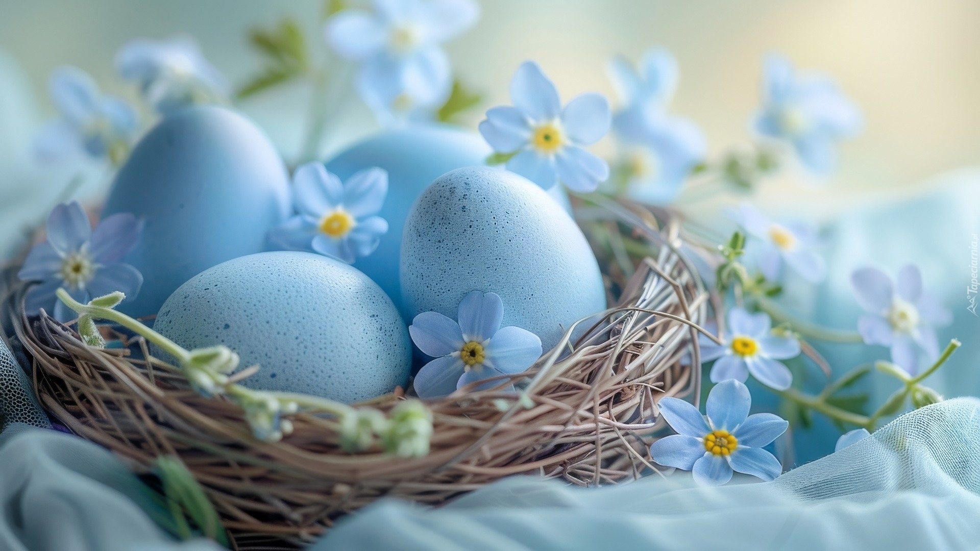 Edytor tapety: Niebieskie pisanki i niezapominajki w gniazdku