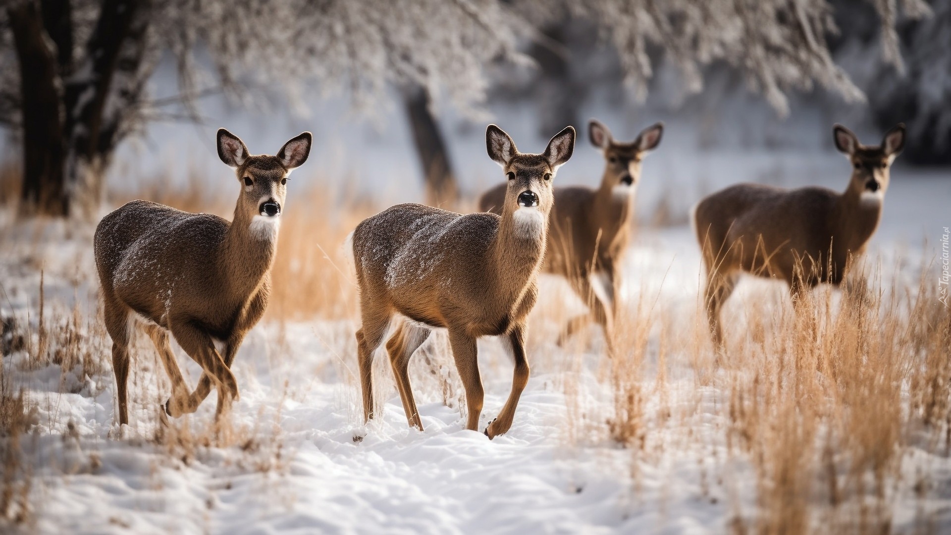 Edytor tapety: Cztery sarny na śniegu wśród suchych roślin