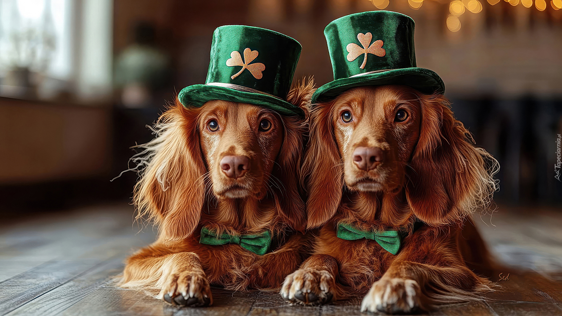 Edytor tapety: Leżące dwa rude psy w zielonych kapeluszach