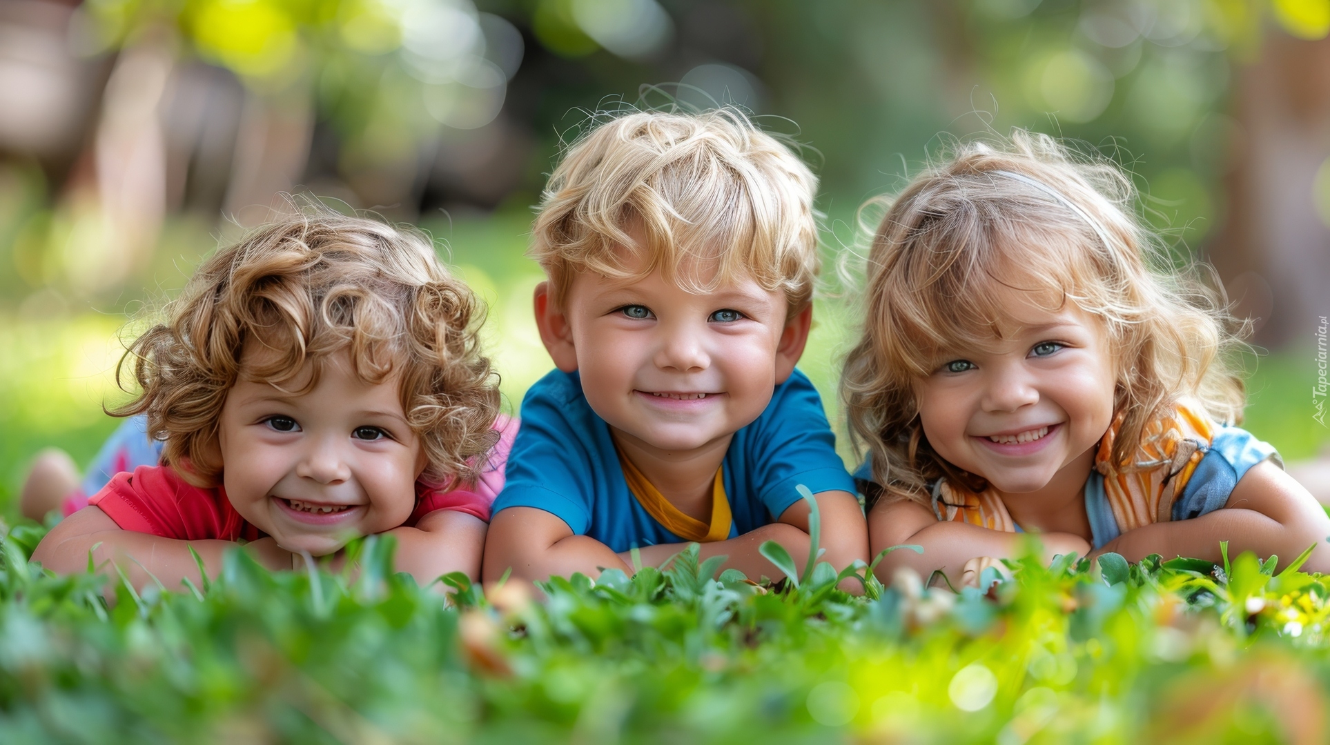 Edytor tapety: Trójka uśmiechniętych dzieci leżąca na trawie