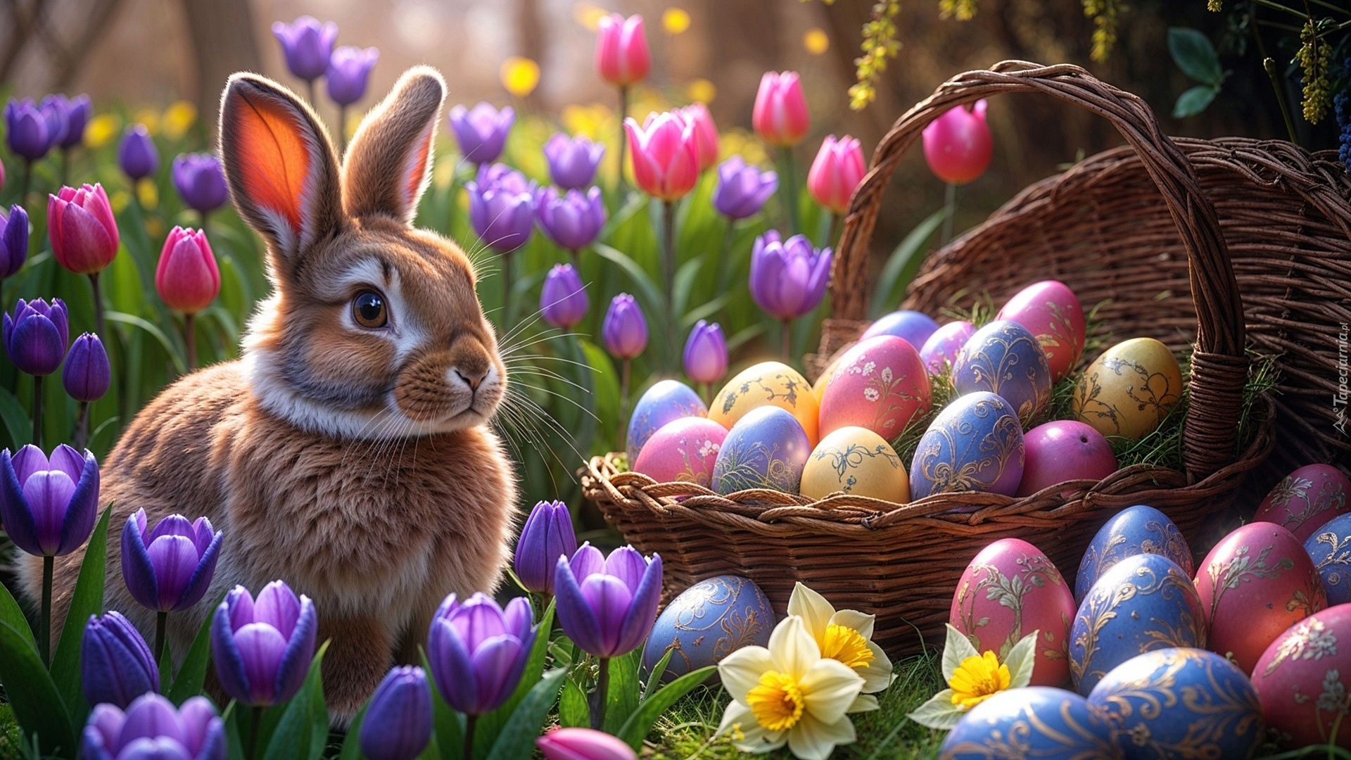 Edytor tapety: Królik obok kolorowych kwiatów i pisanek w koszyku