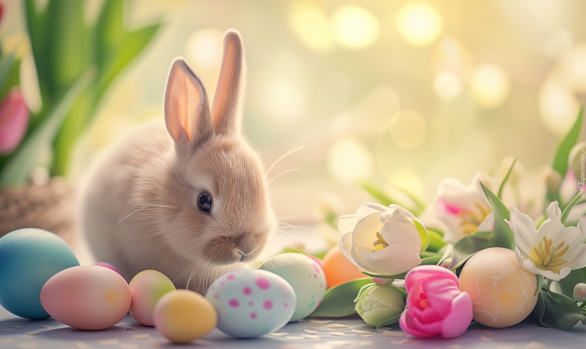 Edytor tapety: Kolorowe pisanki i tulipany obok królika