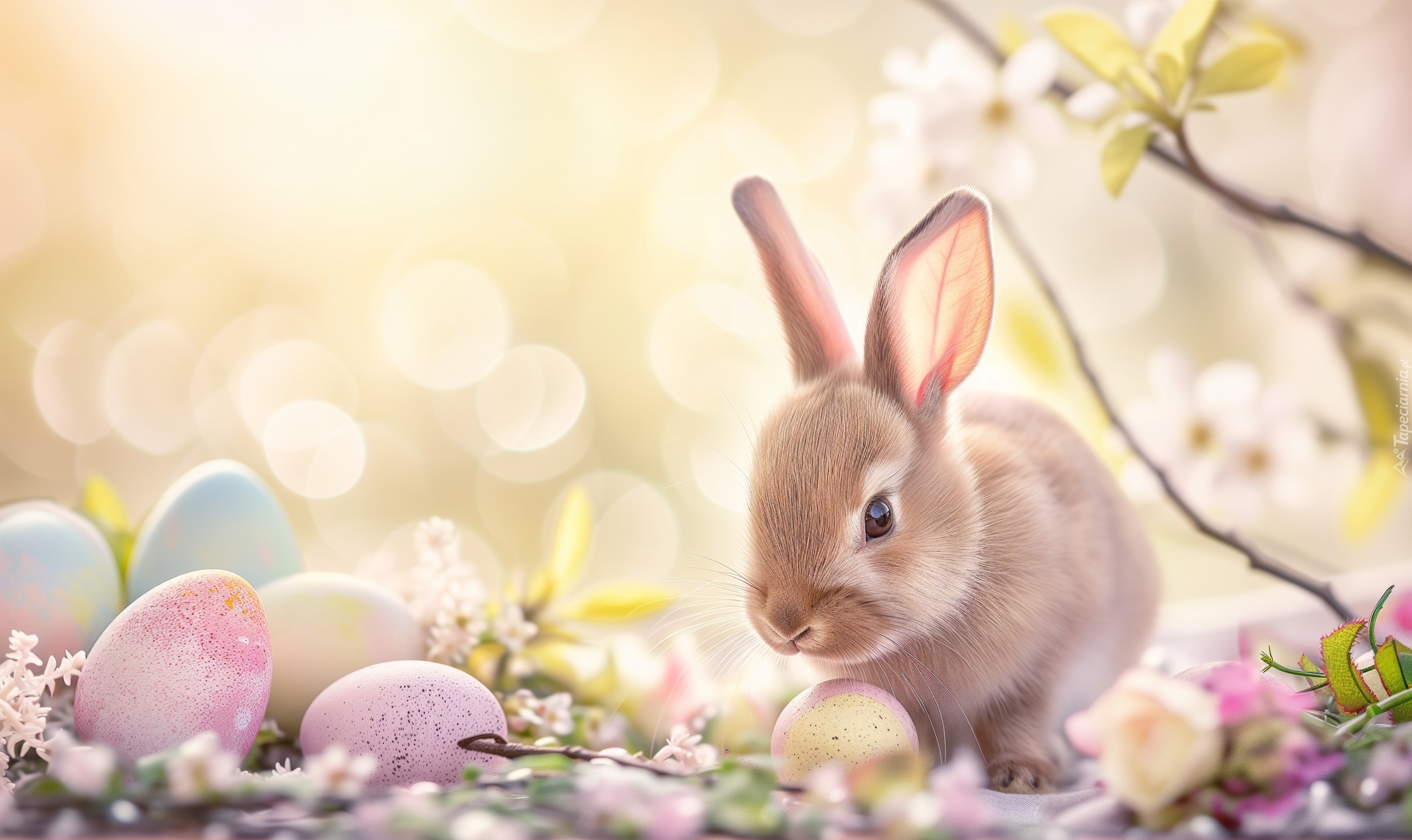 Edytor tapety: Królik i pisanki na rozświetlonym tle